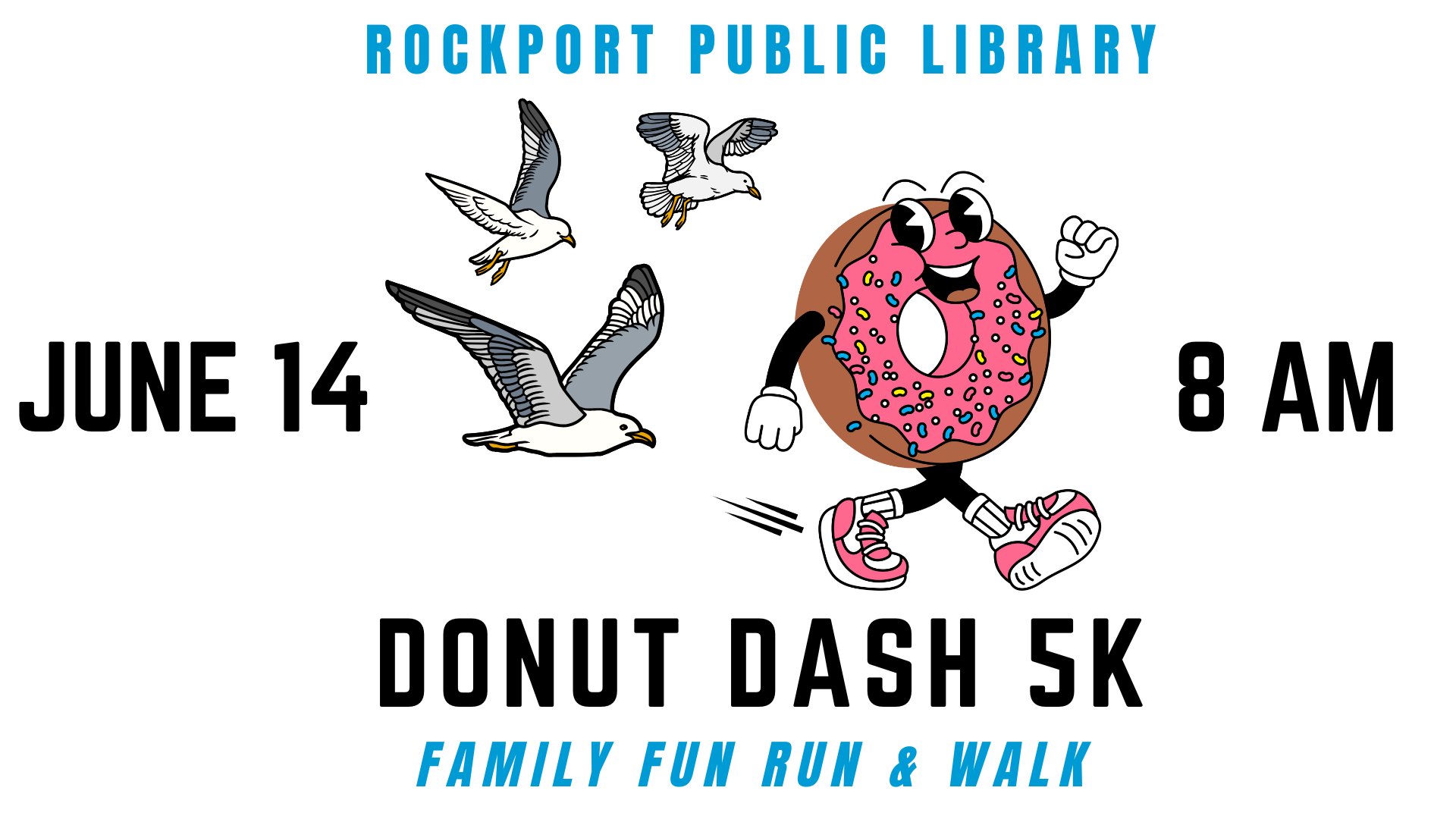 Our 5K Run/Walk starts in beautiful Rockport village right in front of the library. It travels along the coast offering fantastic ocean views. Water and snacks (including donuts!) will be provided after the race in Rockport's Marine Park, while supplies last. This event is open to runners and walkers of all ages and skills. Strollers are allowed, but be mindful of traffic as most of the race does not have a sidewalk. Race day registration is from 7:00 to 7:45 AM at the Rockport Public Library, and the race starts at 8:00 AM. JUNE 14 8 AM The 5K race is open to all! Registration costs $25 for adults 18 and older, and $15 for ages 9 to 17. Kids 8 and under must also register, but there is no charge for them to participate.
