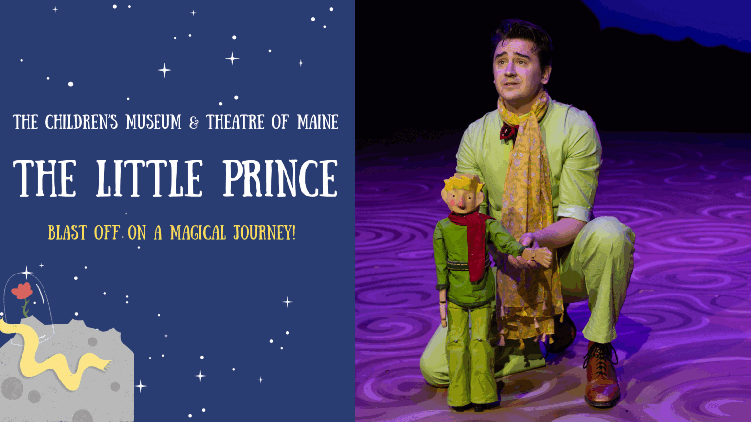 The Children’s Museum and Theatre of Maine bring families on a magical journey that opens with a pilot who crash-lands in the desert and encounters a young wisdom-filled boy from a distant asteroid. As the Little Prince recounts his travels across the universe, audiences will meet curious characters, from a speedy Lamplighter and a clever Fox to a mysterious Rose. Through these fantastical tales, the Little Prince reminds audiences that what really matters most is invisible to the eye.